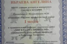 Педагоги до СДЮТиЭ приняли активное участие в муниципальном конкурсе творческих работ « Мир, в радуге профессий», посвященном « Году рабочих профессий в Республике Татарстан». Так, Ибраева Ангелина, победитель в номинации рисунок «Профессии моей семьи», руководитель, педагог до Мухаметшина М.Ш. Кострова С.Р. представила две работы учащихся от имени Малобугульминской СОШ. Номинация рисунок «Профессии моей семьи», Куринская Кира, 1 место, номинация книжка – раскладушка, Князева Елизавета – 1 место.