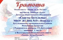 Детское общественное объединение «Скауты Бугульмы» накануне Дня России приняло участие в региональном онлайн-квесте «Знаешь ли ты Россию?». По правилам игры необходимо было команде набрать баллы за скорость и правильность ответов на вопросы и задания. Ребята вспомнили историю нашей страны, географические особенности, спели гимн, нарисовали флаг России. В результате ребята заняли в своей возрастной группе 1 место. Желаем и в дальнейшем юным школьникам новых побед и свершений!