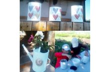 В ход пошли старые лейки, жестяные баночки. Девочки очень постарались и из бросового материала сделали прекрасные интерьерные декорации.