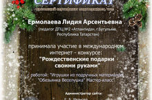 Педагог дополнительного образования, руководитель студии "Волшебная шкатулка" Ермолаева Л.А. получила сертификат за участие в международном интернет-конкурме "Рождественские подарки своими руками".