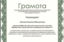 Поздравляем директора МБОУ ДО "Детский (подростковый) центр №3 "Буревестник" Якупову Рушанию Миннуловну с получением грамоты за творчество, инициативу и профессионализм при подготовке и проведении республиканской августовской конференции.