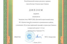 ДИПЛОМОМ лауреата награждается Заргарова Аида, принявшая участие в Республиканском конкурсе рисунков о Древнем городе Болгар и Острове-граде Свияжск в номинации "Культурно-природный ландшафт острова-град Свияжск" под руководством Териковой Г.Р.