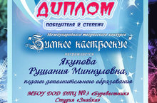 Якупову Рушанию Миннуловну поздравляем с награждением дипломом 2 степени в Международном творческом конкурсе "Зимнее настроение" в номинации: "Декоративно-прикладное творчество" за работу "Снеговик".