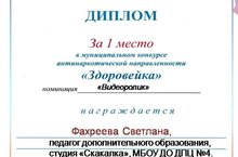 Диплом за I место в Муниципальном конкурсе антинаркотической направленности "Здоровейка" 16.11.2020