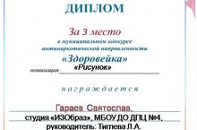 Диплом за III место в муниципальном конкурсе "Здоровейка" антинаркотической направленности в номинации "Рисунок" 16.11.2020