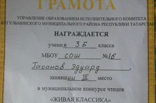 На городском (муниципальном) конкурсе чтецов " Живая классика" Эдуард Гасанов занял 3-е место 28.02.2018