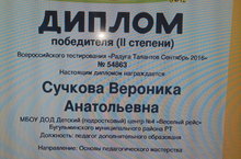 Всероссийского тестирования «Радуга Талантов Сентябрь 2016» № 54863 Настоящим дипломом награждается Сучкова Вероника Анатольевна 06.09.2016