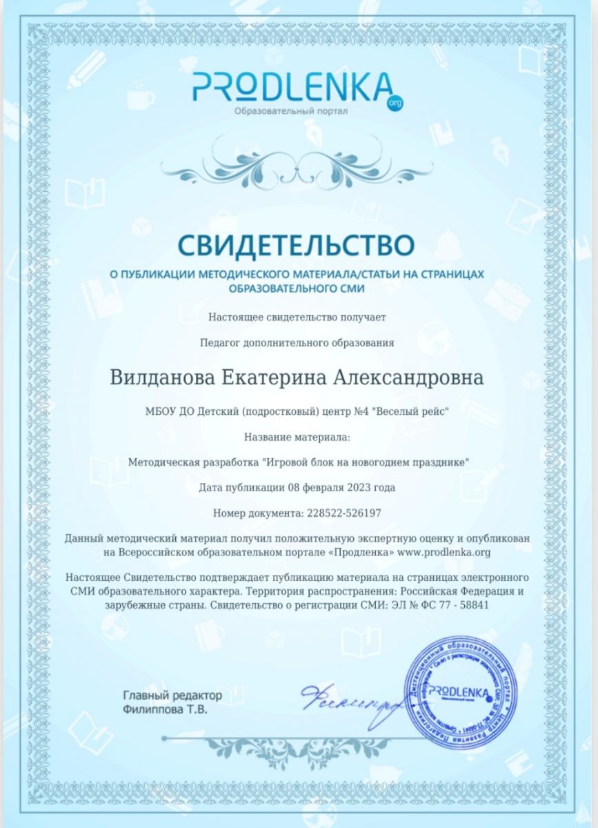 5. Свидетельство о публикации методического материала/статьи на страницах образовательного СМИ PRODLENKA, Методическая разработка, Свидетельство, Вилданова Е.А..jpg
