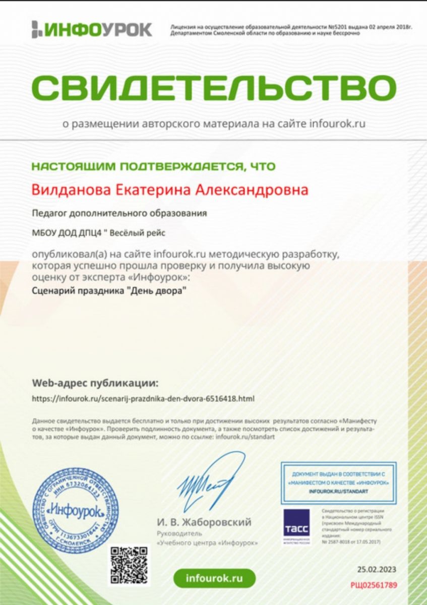7. Размещении авторского материала на сайте infourok.ru, Сценарий праздника, Свидетельство, Вилданова Е.А.jpg