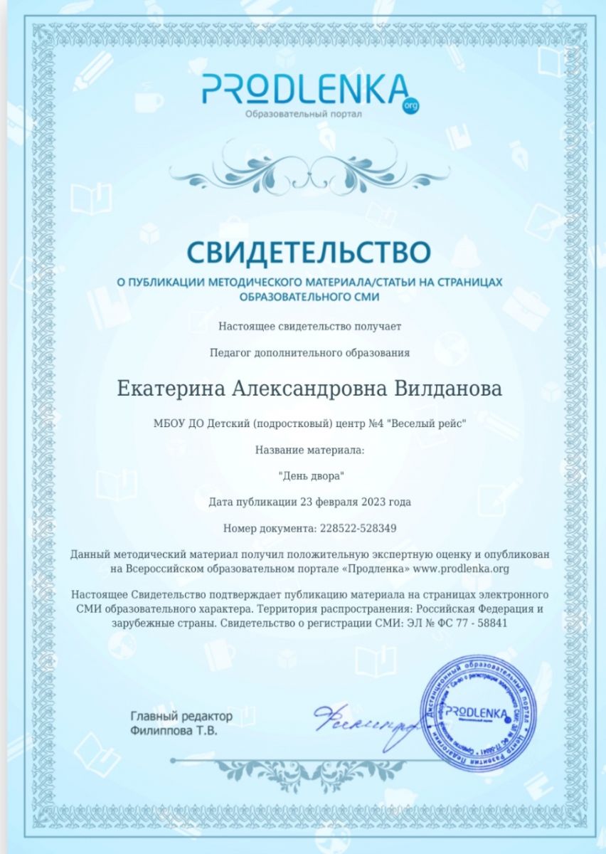 6. Свидетельство о публикации методического материала/статьи на страницах образовательного СМИ PRODLENKA, "День двора", Свидетельство, Вилданова Е.А..jpg