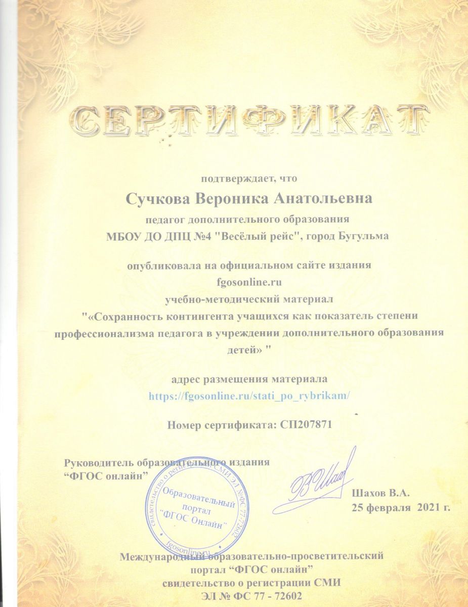 Публикация на официальном сайте издания "ФГОС онлайн" .Учебно-методический материал "Сохранность контингента как показатель степени профессионализма педагога в учреждении дополнительного образования детей" Сертификат