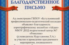 Администрация ГБУ «Центр содействия семейному устройству детей г.Бугульмы» РТ выражает огромную благодарность руководителю танцевального коллектива «Айдан» ДПЦ №7 "Ровесник".