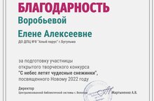 Благодарность за подготовку участницы Кондря Аурелии в открытом Всероссийском конкурсе "С небес летят чудесные снежинки", посвященного Новому 2022 году.