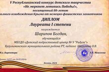Поздравляем Богдана Шарипова и Оксану Владимировну с очередной победой в Республиканском конкурсе детского творчества "Не меркнет летопись победы", посвященный 80-летию полного освобождения Крыма от немецко-фашистских захватчиков.
