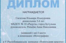 Поздравляем воспитанницу старшей группы, Сагитову Ильмиру, занявшая I место в Республиканском конкурсе "Новогодняя красота". Желаем в дальнейшем творческих идей и успешных достижений!