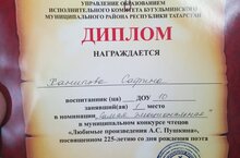 Воспитанница подготовительной группы, Ханипова Сафина, приняла активное участие в муниципальном конкурсе чтецов "Любимые произведения А.С. Пушкина" со стихотворением "Зимнее утро" и заняла первое место в номинации "Самая эмоциональная". Поздравляем нашу Сафину с победой и желаем в дальнейшем творческих успехов!