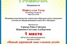 Шафигуллина Тагира, Бодрова Георгия, Хасанова Ильдана, Багаева Никиту, воспитателей 2 младшей, средней и подготовительной групп поздравляем с очередной победой в IV Всероссийском конкурсе рисунков по ПДД “Новый дорожный знак глазами детей”.