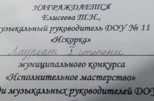 Музыкальный руководитель Елисеева Татьяна Николаевна стала победительницей муниципального конкурса среди музыкальных руководителей детских садов Бугульминского муниципального района в номинации «Исполнительное мастерство». Поздравляем с победой!