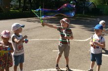 В детском саду прошёл «Праздник мыльных пузырей». Воспитатели вместе с детьми приготовили жидкость для надувания пузырей, разные предметы для экспериментирования (коктейльные трубочки, пластиковые бутылочки, кольца, трафареты, рамку из шнура и т.д.). С помощью пластиковых бутылочек, у которых на отрезанное донышко натянута махровая ткань, ребята выдували пенные дорожки (игра «У кого дорожка длиннее»). В конкурсе «У кого пузырь больше» пробовали надуть пузыри с помощью разных приспособлений. А используя коктейльные трубочки, устроили конкурс на самую пышную мыльную пену и поиграли в подвижную игру «Мыльные пузыри», где дети сами превратились в летающие мыльные пузыри.