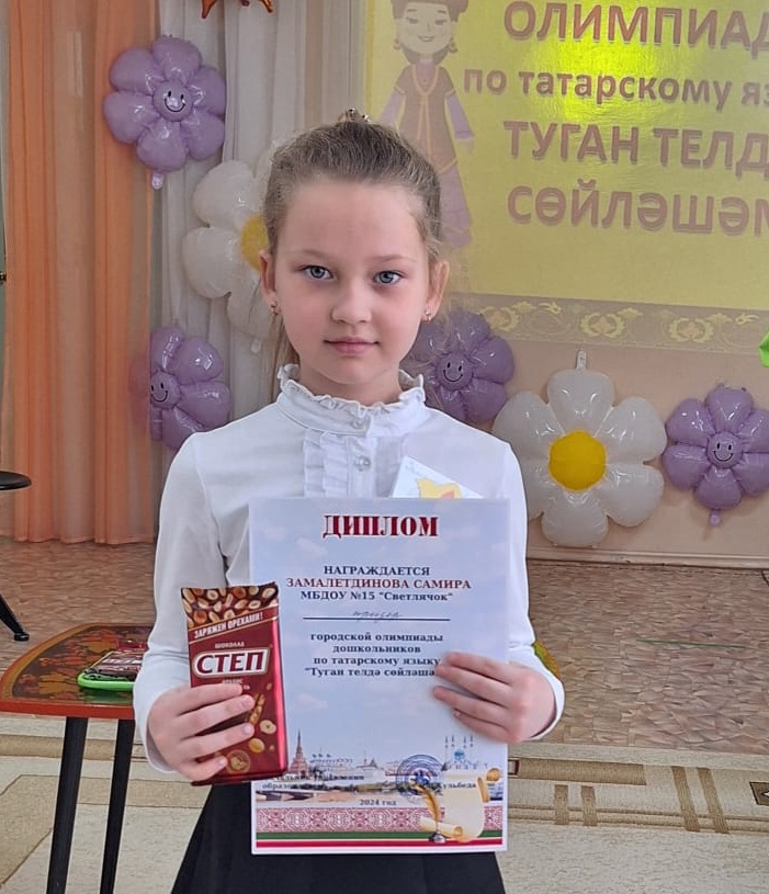 26 марта на базе детского сада № 2 “Батыр” прошла городская олимпиада по татарскому языку для воспитанников 6-7 лет «Туган телдә сөйләшәм». Всего в олимпиаде участвовали 26 детских садов. Олимпиадные задания носили характер повышенной сложности, нестандартного подхода к решению заданий. Воспитанница подготовительной к школе группы “Ляйсан” Замалетдинова Самира стала ПРИЗЁРОМ!
