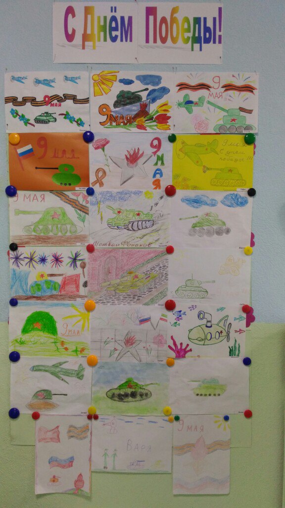 Опубликовано: 04.05.2017В преддверии Дня Победы в средней группе «Ляйсан» (воспитатели Ганеева З.Г., Фаттахова Л.С.) была организована тематическая выставка рисунков «С Днём Победы!»