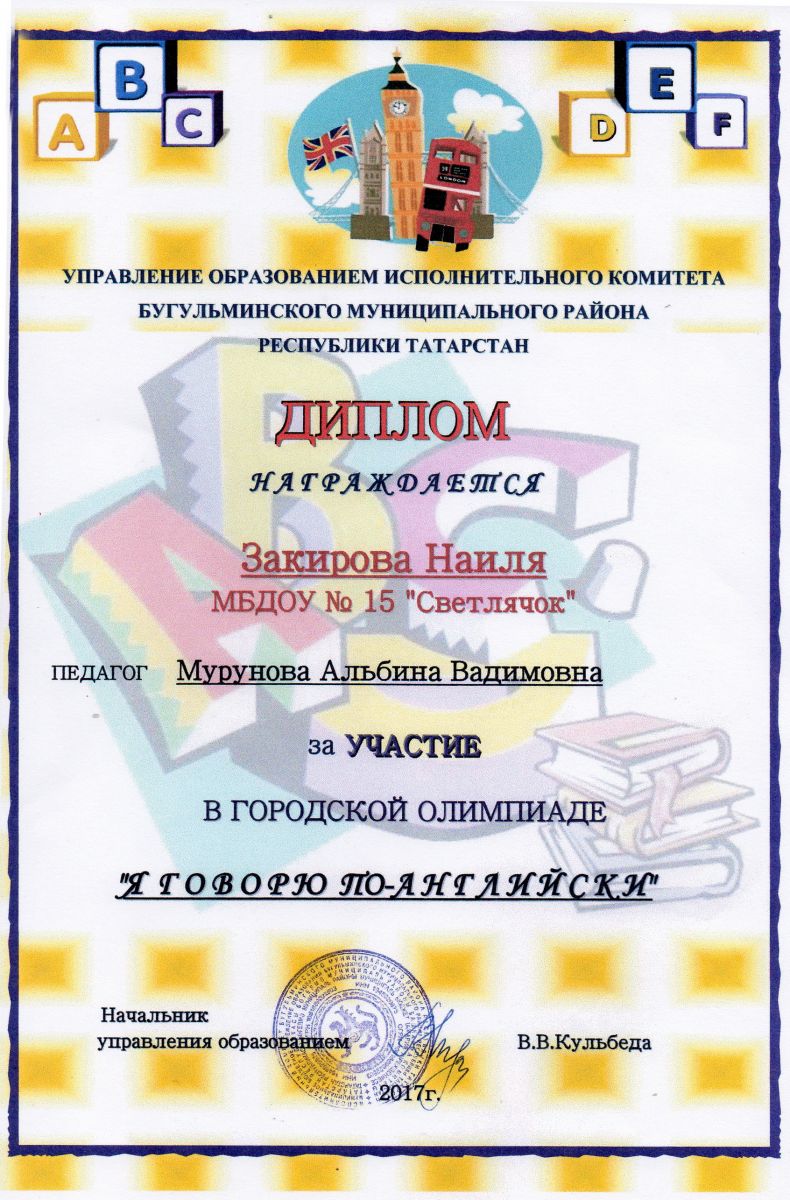 Поздравляем Закирову Наилю с победой! Она достойно представила детский сад на городской олимпиаде «Я говорю по-английски». МОЛОДЕЦ!!!