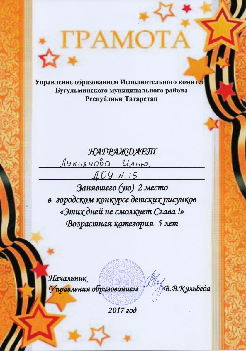 II место в конкурсе заняли - воспитанник подготовительной группы "Звёздочки" Прудкий Богдан (воспитатели: Асфандиярова Р.Р., Тихонова К.Б.) и воспитанник старшей группы "Почемучки" Лукьянов Илья (воспитатели: Андреева И.В., Губина Л.В.).