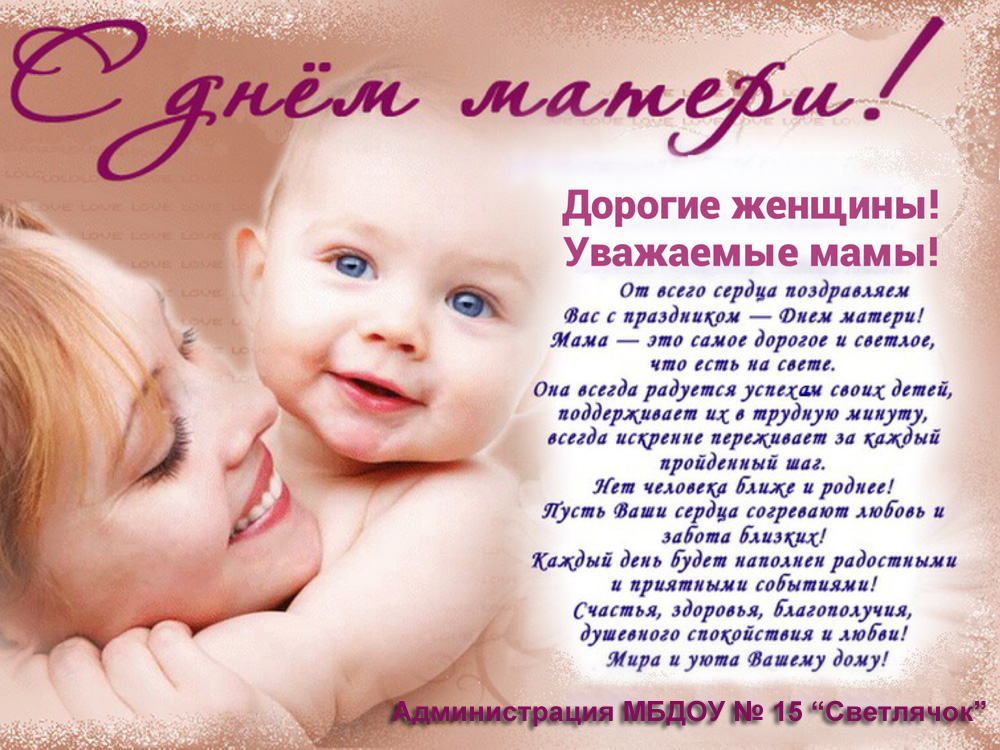 Дорогие мамы, этот день — прекрасный повод выразить Вам своё восхищение, любовь и уважение, преклониться перед Вашим чутким и отзывчивым материнским сердцем.