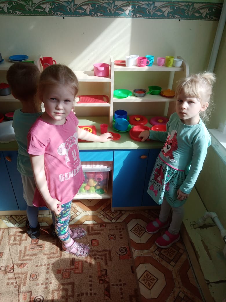 Дети очень любят играть с посудой на кухне. Во время игры ребята закрепляли названия посуды, самостоятельно прибиралиее на место.