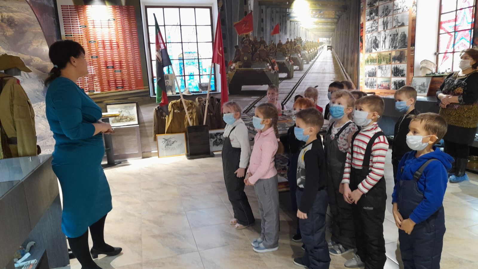 В связи с этим, воспитанников подготовительной к школе группы «Ягодка» (воспитатель Калинина Н. А.) 3 декабря пригласили на экскурсию в музей Боевой Славы «Память», который расположен на территории военного комиссариата г. Бугульмы.