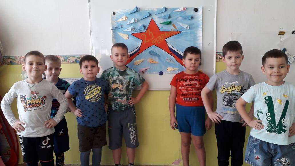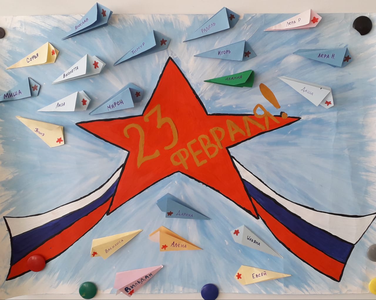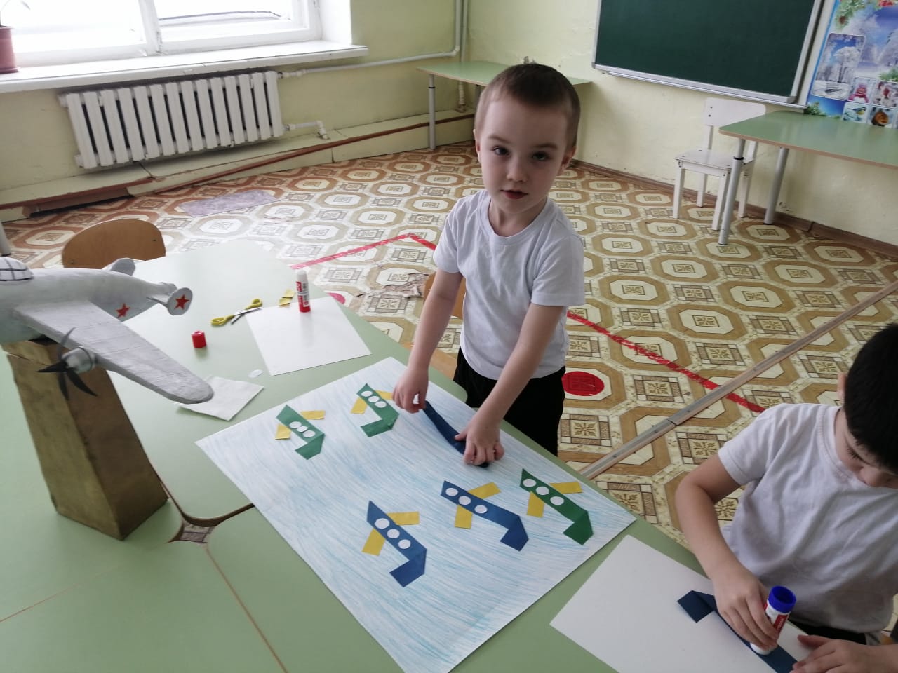 В канун праздничного дня дети изготовили для пап и дедушек открытки, выполнили коллективную аппликацию "Летят самолёты".