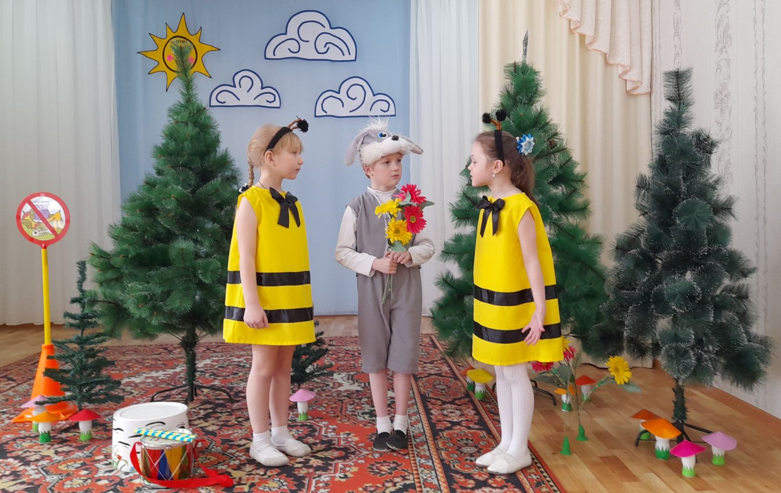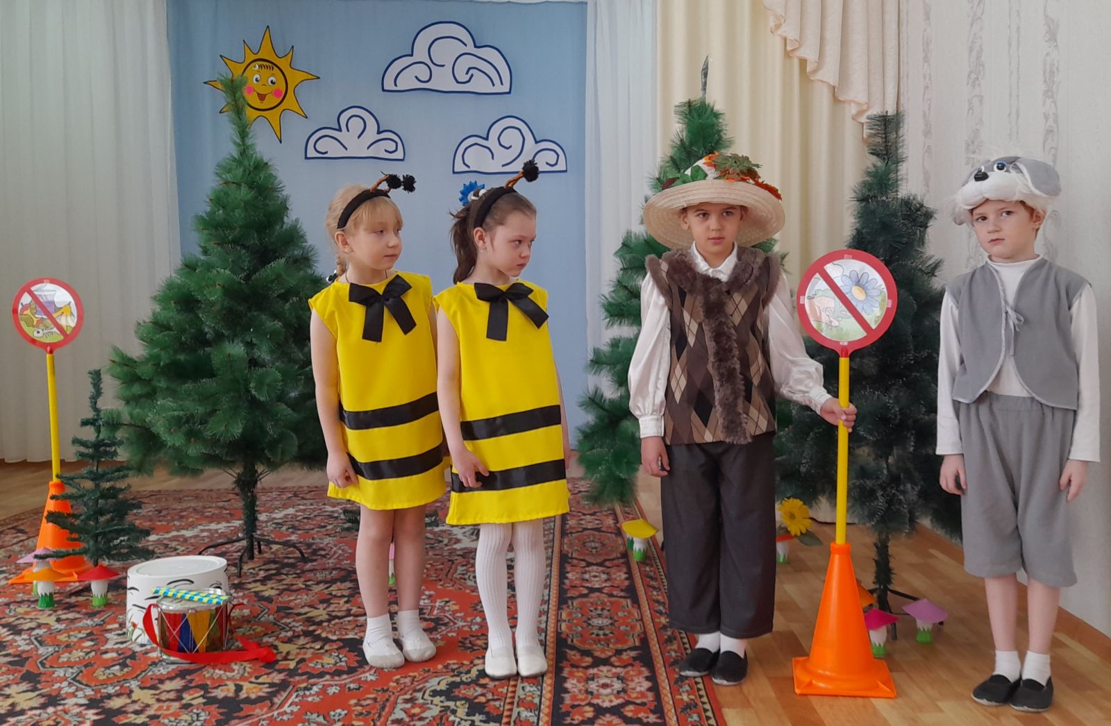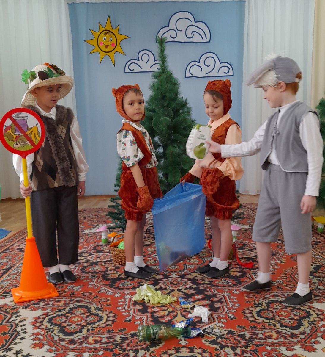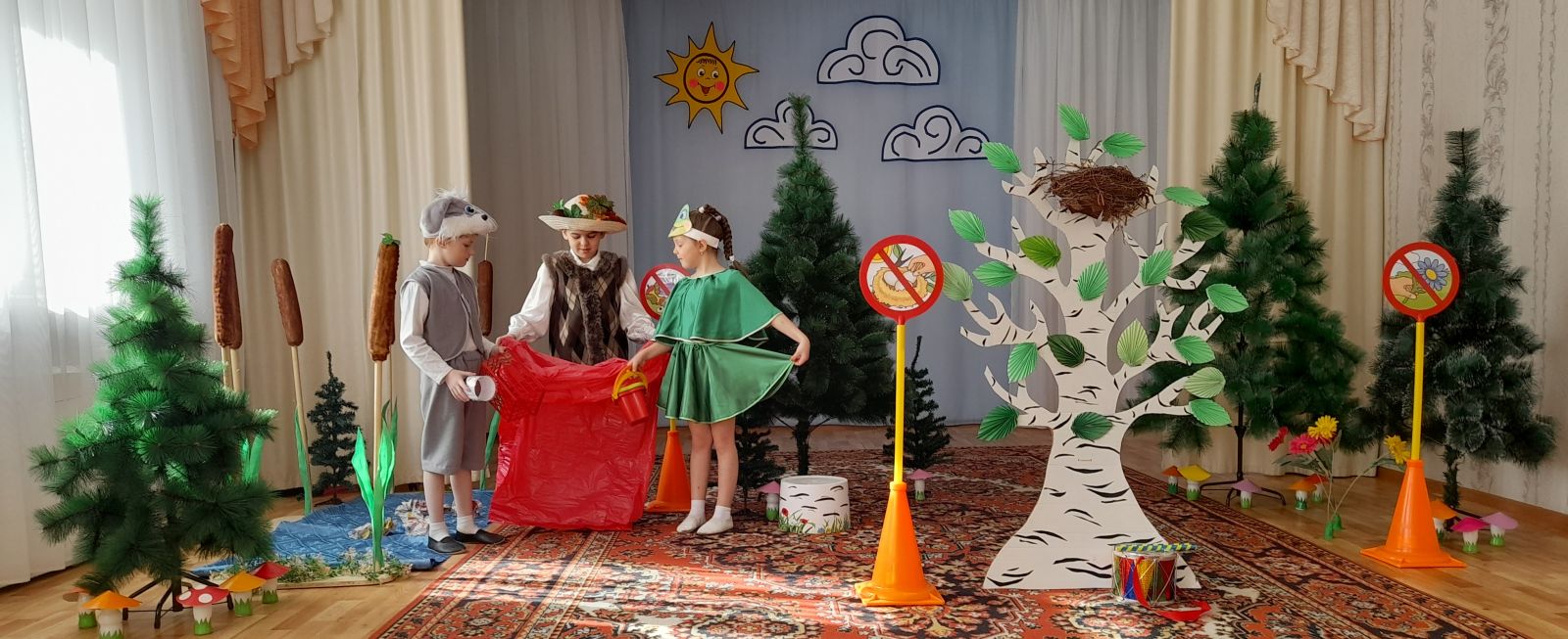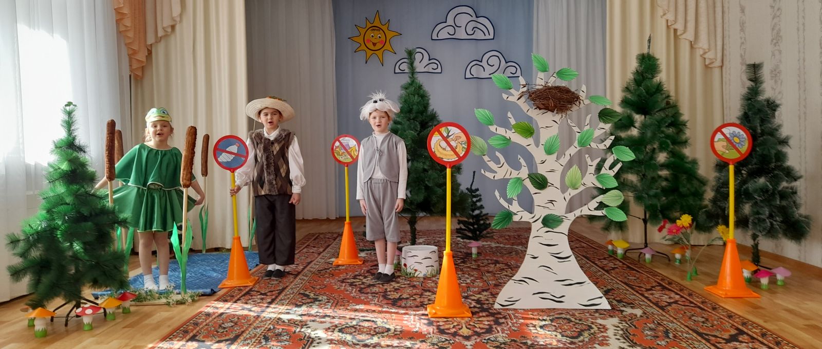 На протяжении театрализованного представления Лесовик учит зайца Коську правилам поведения в природе, используя экологические знаки: «Не оставляй мусор», «Не шуми в лесу», «Не разоряй птичьи гнёзда», «Не рви в лесу цветы», «Не засоряй водоёмы» и др.