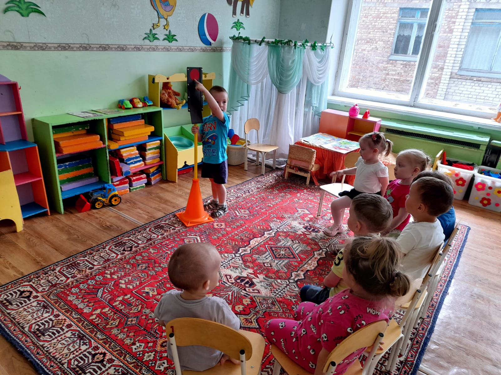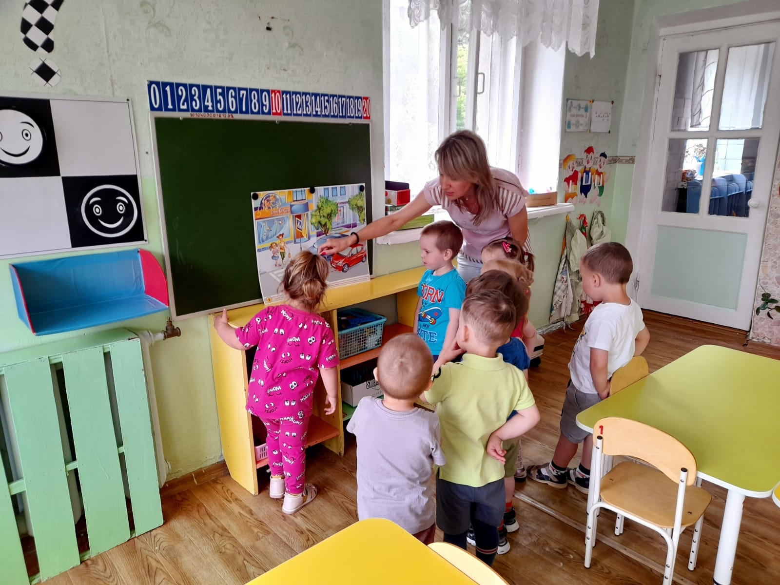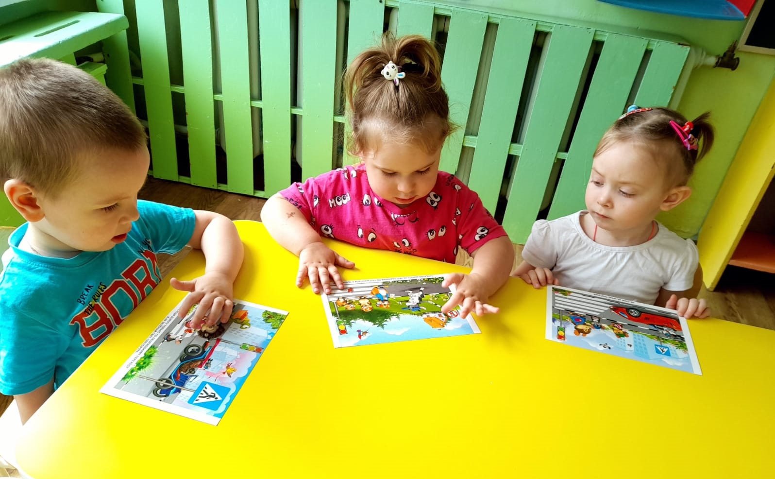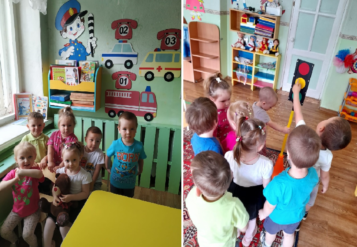 При проведении занятий с малышами крайне важна наглядность. Поэтому в группе много игрушечного транспорта разного вида, набор рулей, светофор, тематические книги, альбомы, тематические наборы иллюстраций.