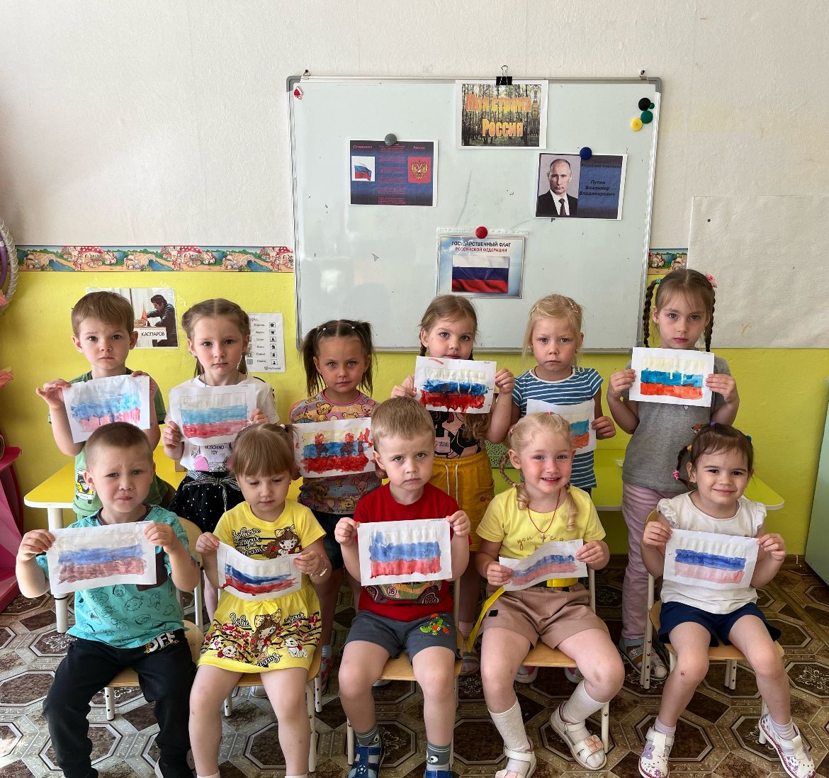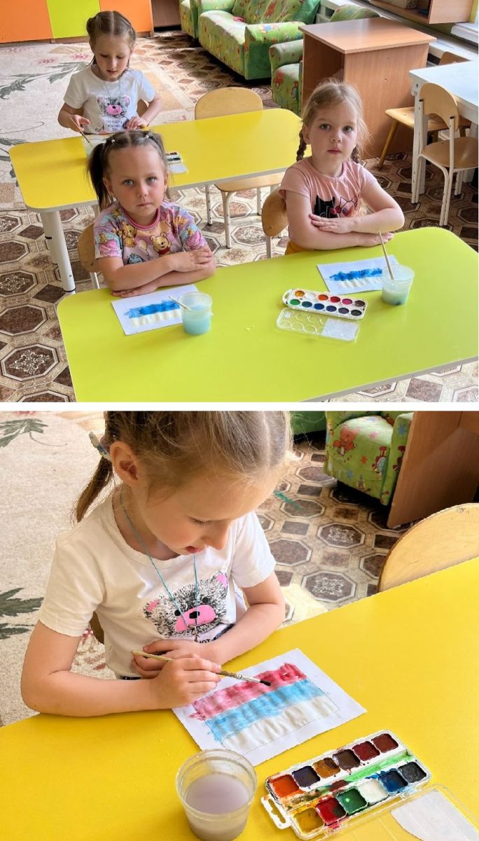 Воспитатель Гатауллина Д. М. провела с детьми занятие по теме дня, где дошкольники прослушали гимн России, познакомились с историей возникновения флага нашей Родины, с интересом рассматривали его, закрепили знания цветов флага, а затем рисовали триколор, используя приёмы рисования кисточкой и акварельными красками.
