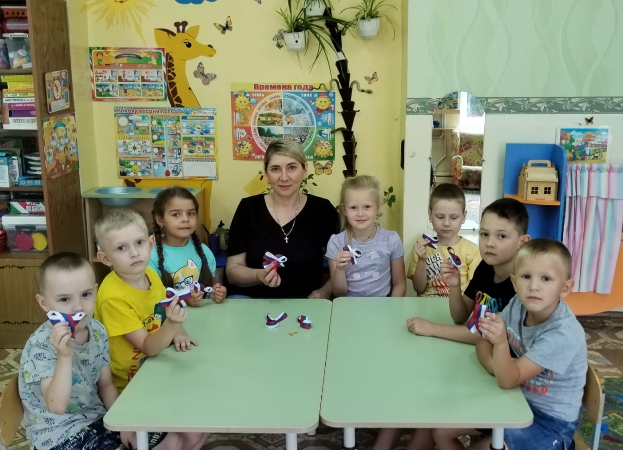 В средней группе "Солнышко" (воспитатели Деркач З.М., Бородина М.Н.) сегодня прошла творческая мастерская по изготовлению коллективной аппликации с элементами оригами "Флаг России — мой флаг".