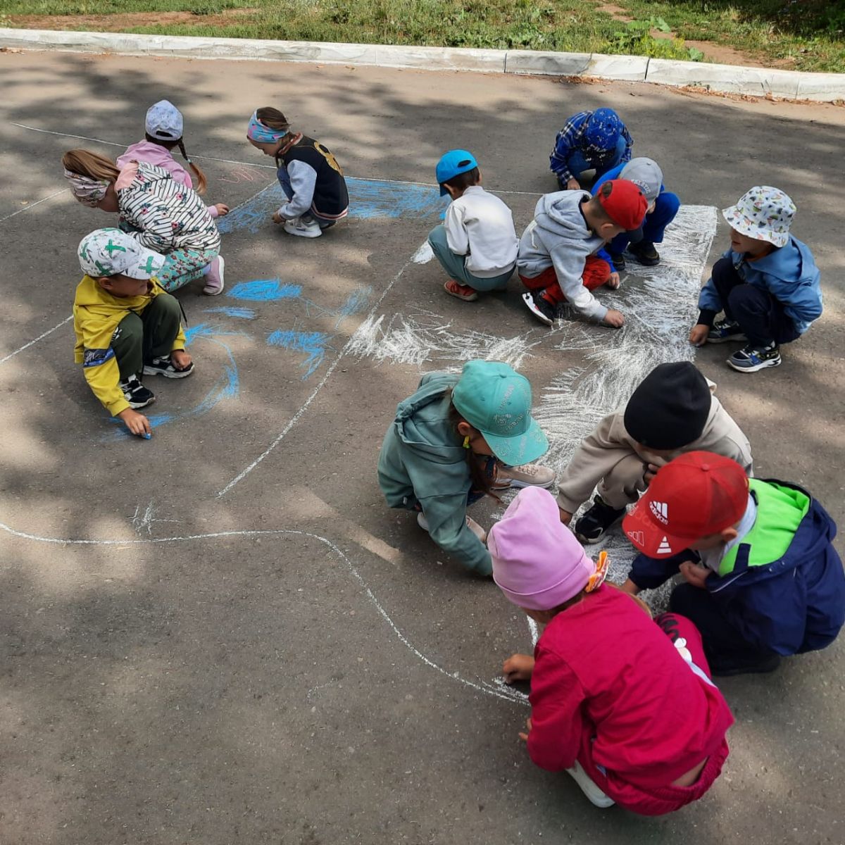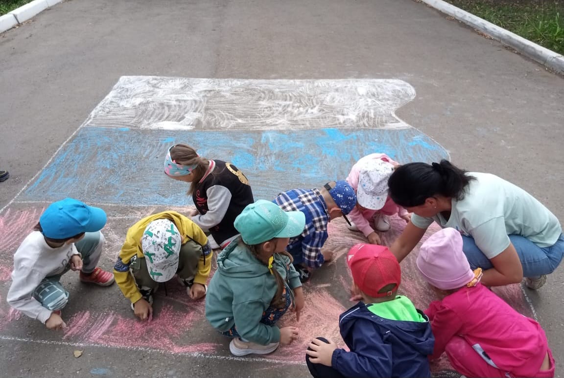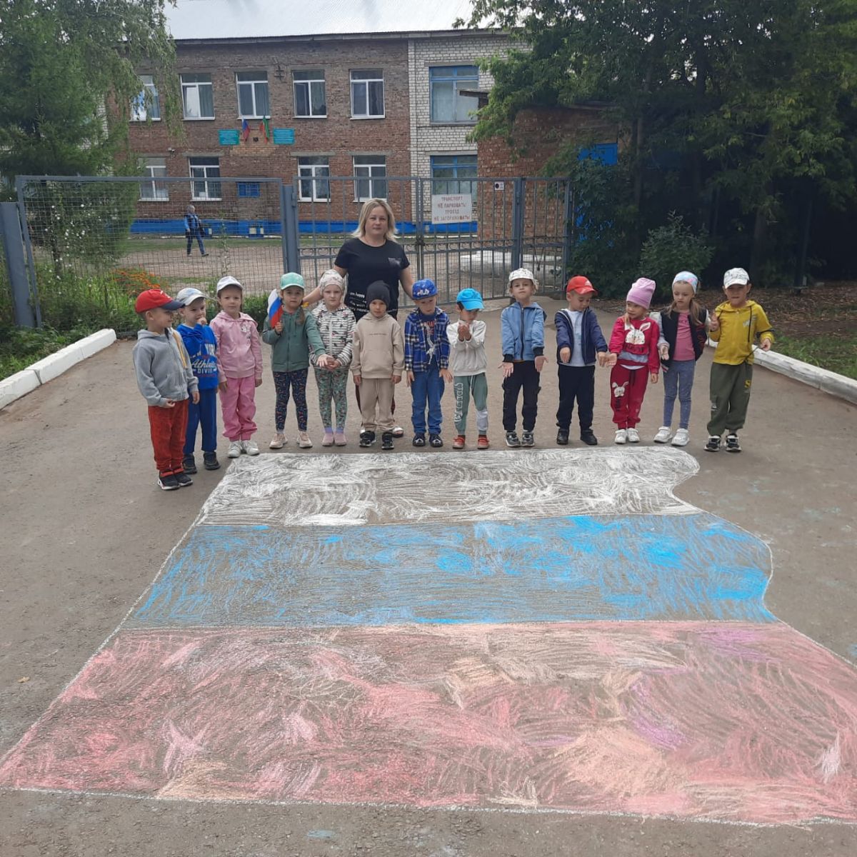 В средней группе "Ромашки" (воспитатели Ефимова Е.Х., Морякова Т.И.) прошёл арт-марафон рисунков на асфальте "Я рисую родной флаг".