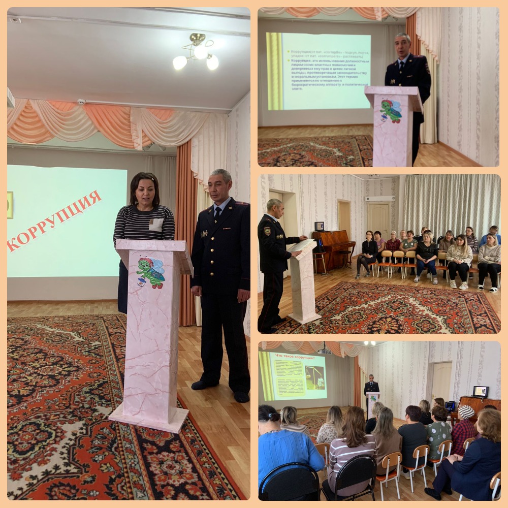 06.12.2023г. В рамках проведения Международного дня борьбы с коррупцией сегодня состоялся просмотр видеоролика с последующим обсуждением с сотрудниками на тему «Коррупция». На данное мероприятие был приглашён участковый по Бугульминскому району и городу Бугульма Гайнанов Д.В., который в свою очередь рассказал сотрудникам детского сада о различных видах мошенничества. Предупредил, чтобы были внимательны и бдительны, особенно когда оставляют свои личные данные.