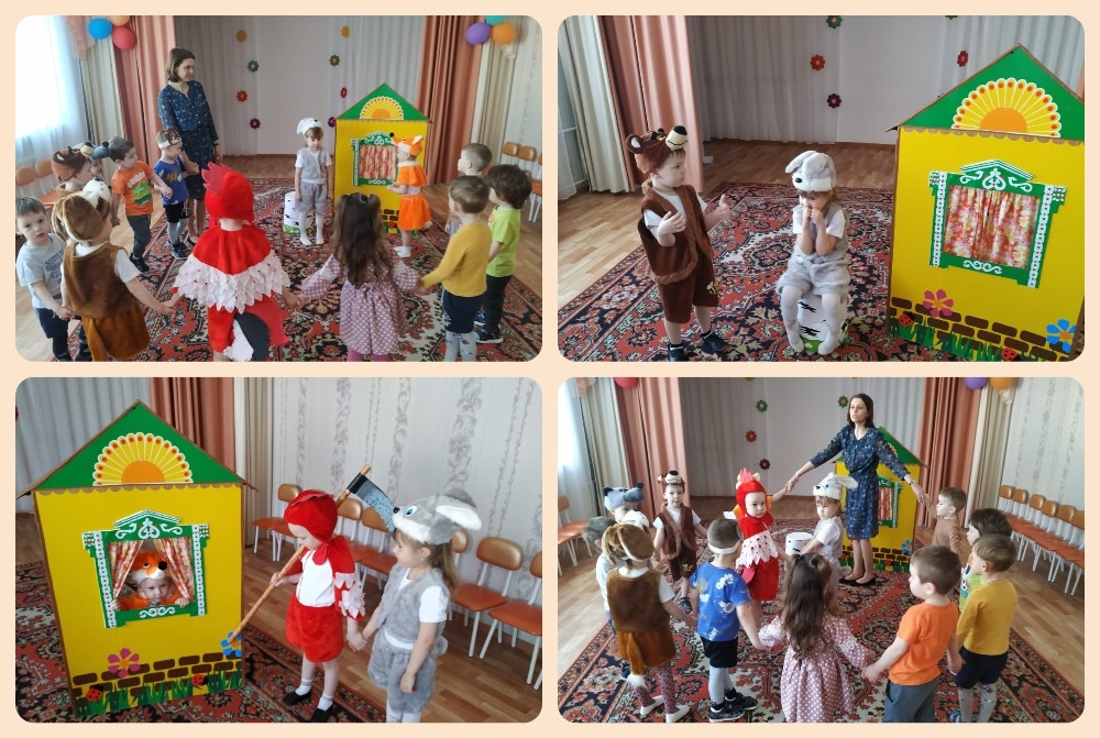 22.03.2024 г. Во второй младшей группе "Почемучки" (воспитатель Губина Л.В.) прошла неделя "Театра и музыки для детей". Итоговым мероприятием стала игра-драматизация, по сказке "Заюшкина избушка". В данном виде деятельности, каждый ребёнок проявляет свои эмоции, чувства и взгляды, причём не только наедине с собой, но и публично, не стесняясь присутствия взрослых и сверстников. Дети учатся замечать и оценивать свои и чужие промахи и успехи, становиться более раскрепощёнными, общительными, смелыми.
