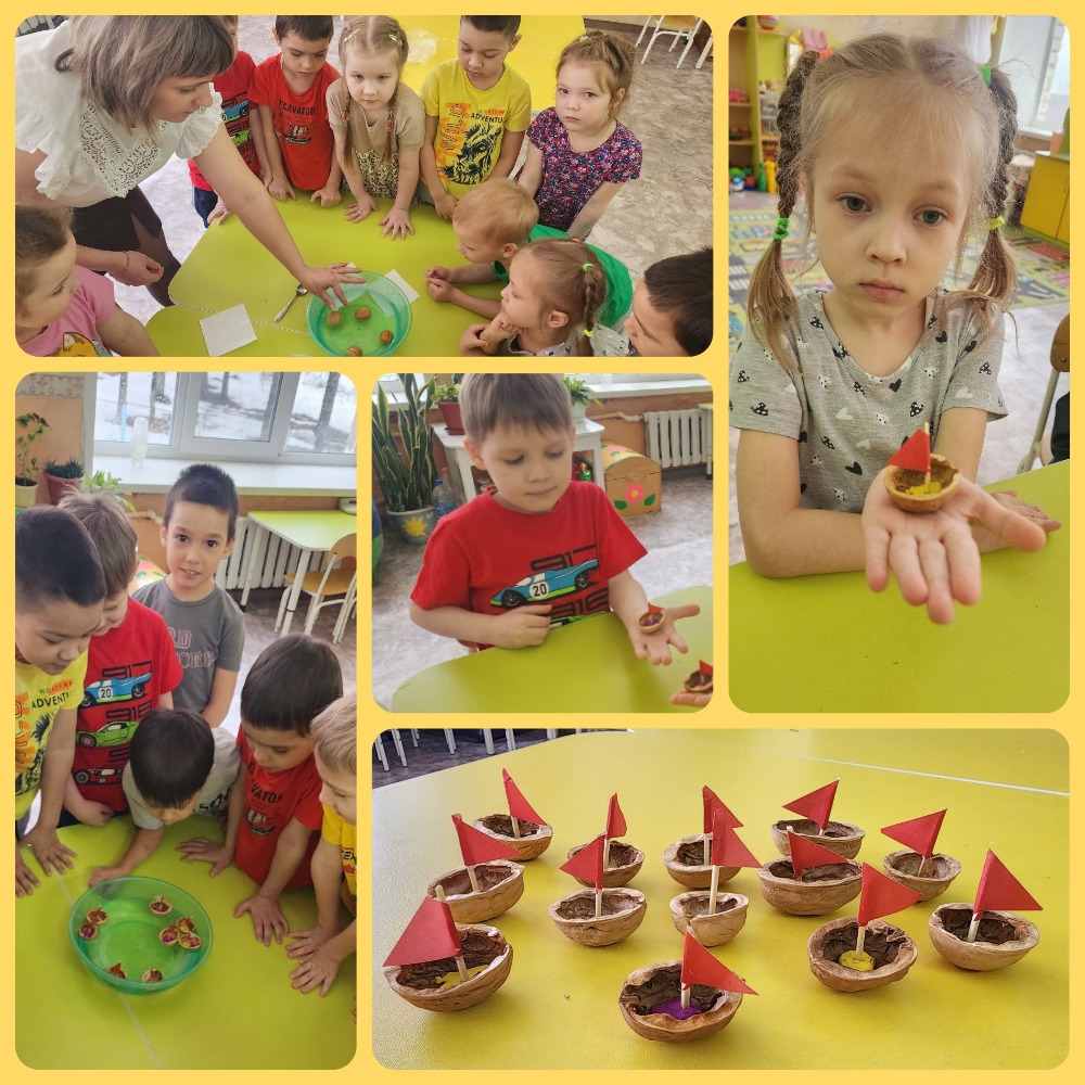 Посмотрели презентацию, из которой узнали как растёт грецкий орех, узнали о его пользе и о том, что ядрышко ореха похоже на мозг человека, а запах листьев отпугивает комаров и мух. Затем дети рассмотрели настоящие грецкие орехи, провели опыт "Тонет - не тонет." А после из скорлупы ореха сделали кораблики и запустили их в воду. Такие маленькие кораблики можно запустить с родителями в весенние ручьи.