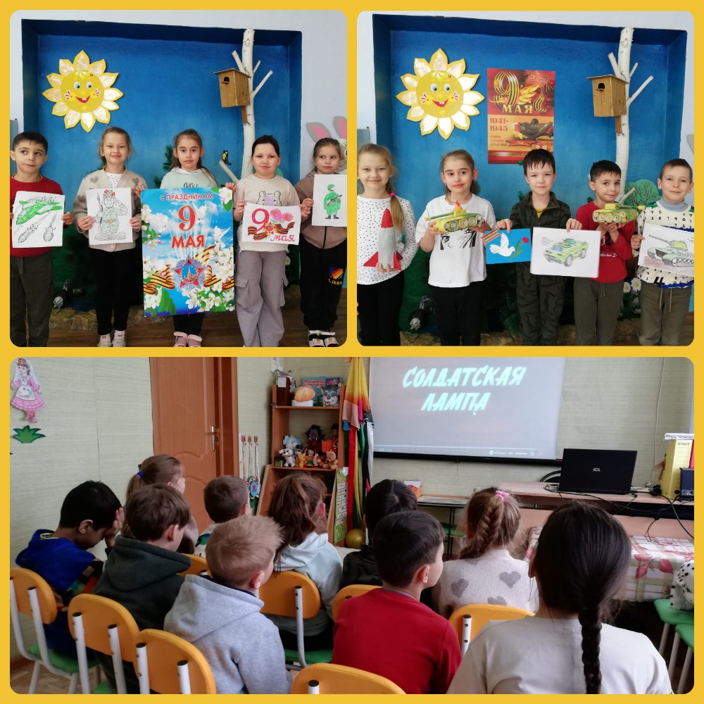 В преддверии этой замечательной даты в целях патриотического воспитания дошкольников, любви к своей Родине и уважения к людям, которые ковали Победу, в подготовительной к школе группе "Ляйсан" (воспитатели Ганеева З.Г., Фаттахова Л.С) провели беседы "День Победы", "Мы помним, мы гордимся", рисовали рисунки, сделали поделки, просмотрели мультфильм «Солдатская лампа», фильм «Детям о войне».