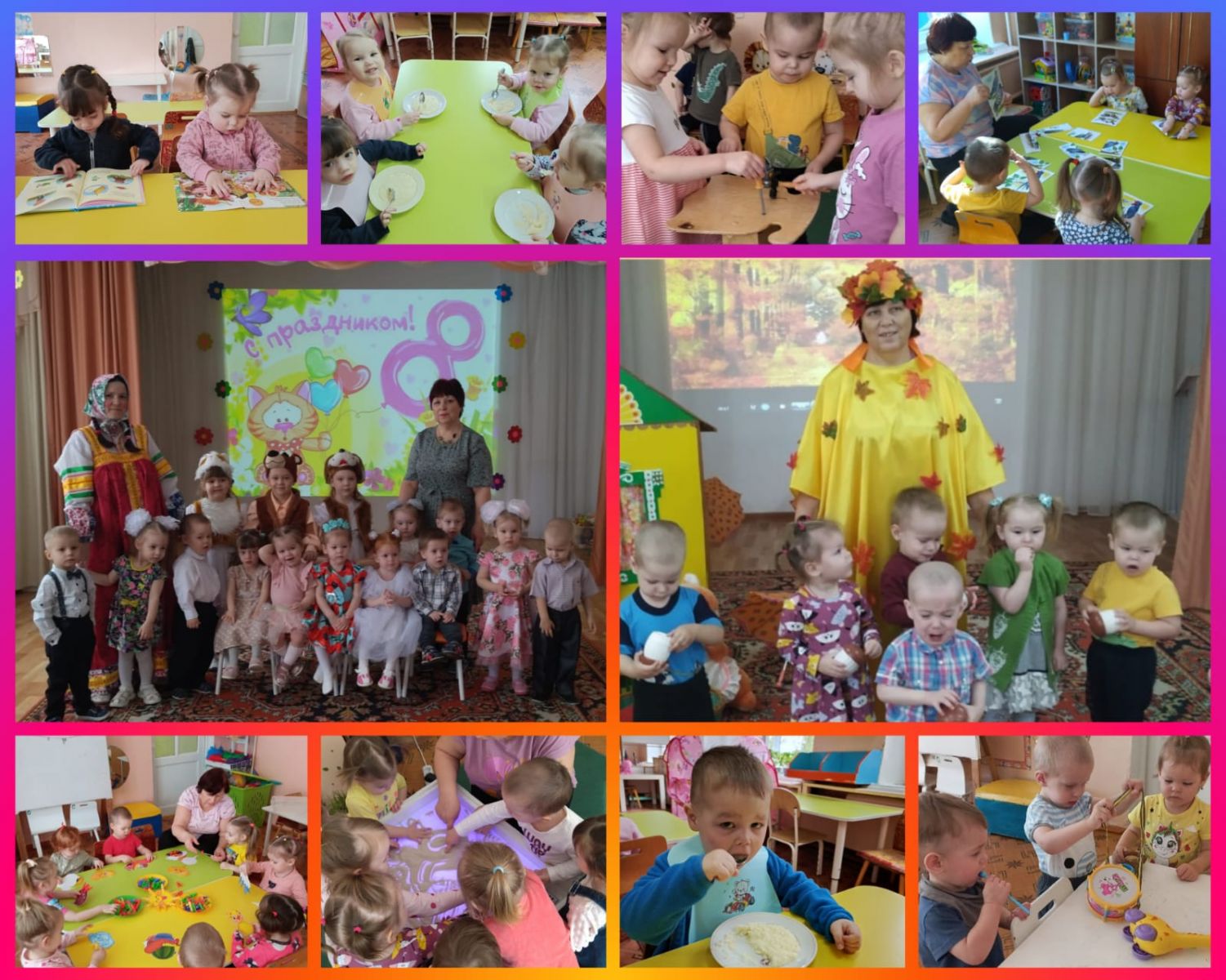Наши дети почти целый год ходили в ясельную группу. Они пришли такими крошками, всего боялись, плакали, каждый звал свою маму. А теперь посмотрите, какими они стали большими. Умеют правильно держать ложку и самостоятельно кушать, одеваться, и песни петь! А как они умеют рисовать!..