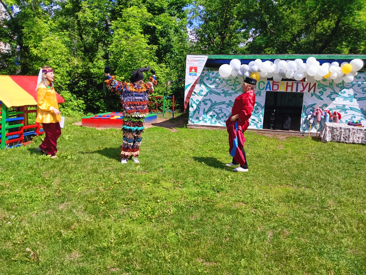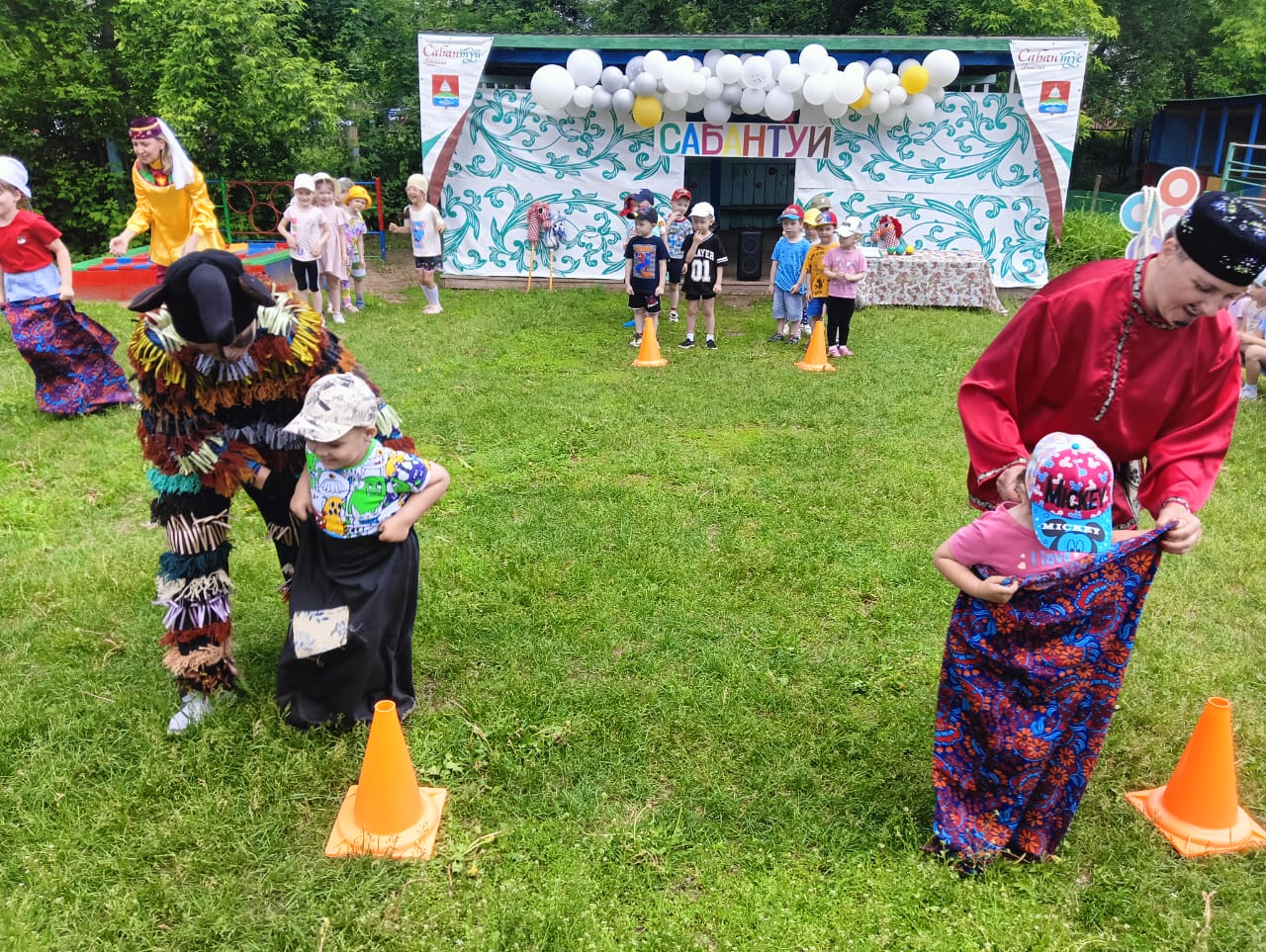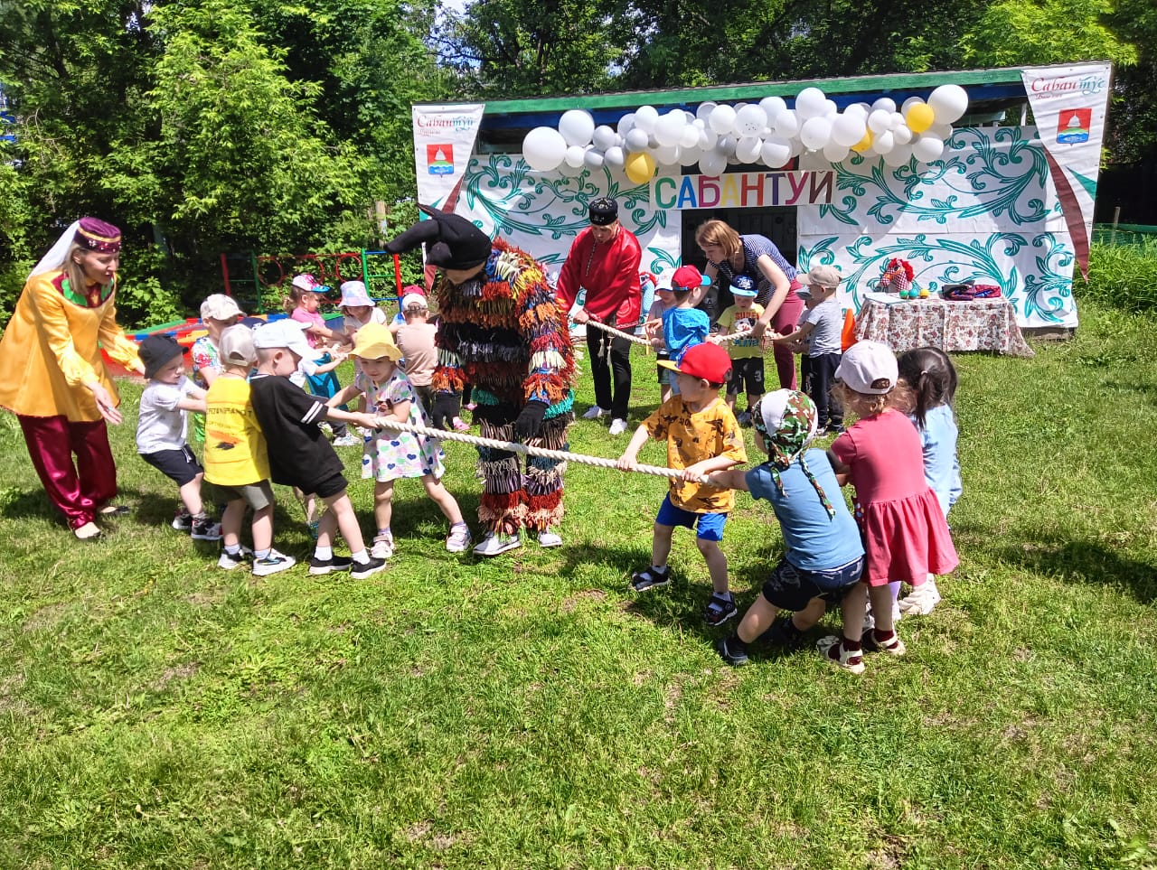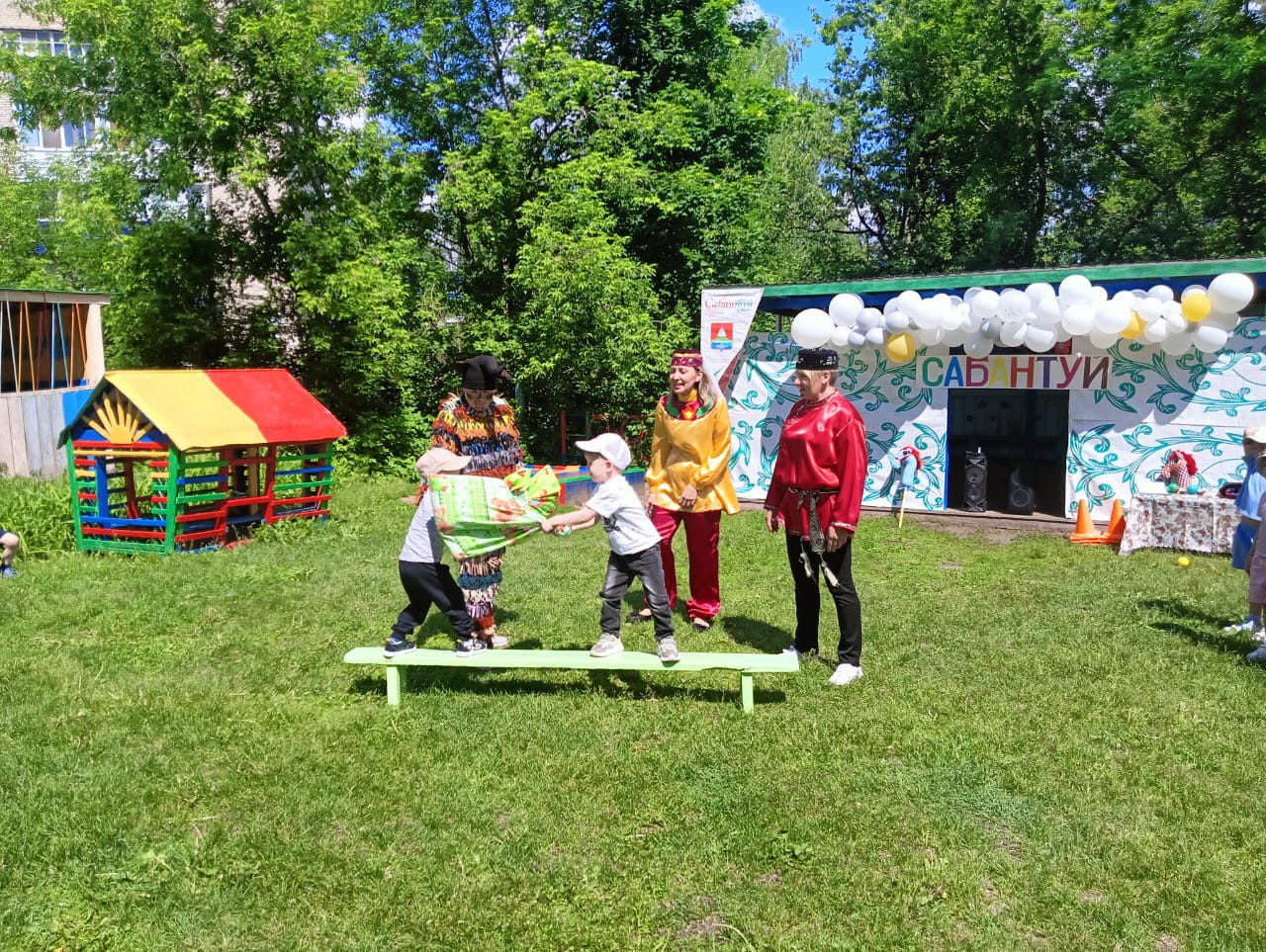 Вместе с ведущей (Бадреева Э.И.) ребята встретили на празднике сказочных героев Батыра (Деркач З.М.) и Шурале (Хабипова А.Р.). Праздновался Сабантуй весело и зажигательно. Все желающие состязались в быстроте, выносливости и смекалке. Дети принимали участие в народных играх и национальных состязаниях. Дружно перетягивали канат, бегали в мешках, участвовали в состязании «бой с мешками», в импровизированных «скачках на лошадях», соревновались, кто быстрее донесет яйцо в ложке.