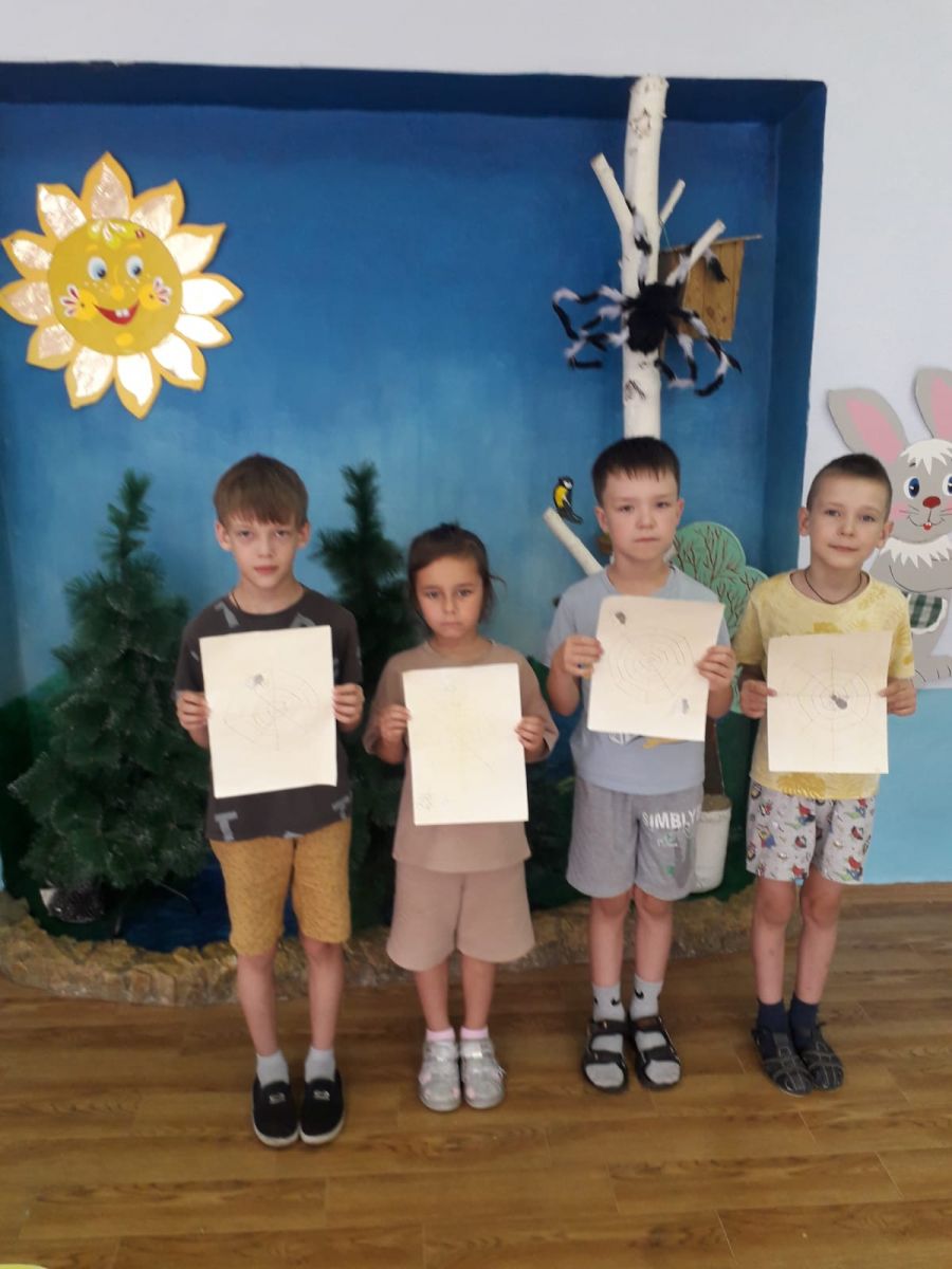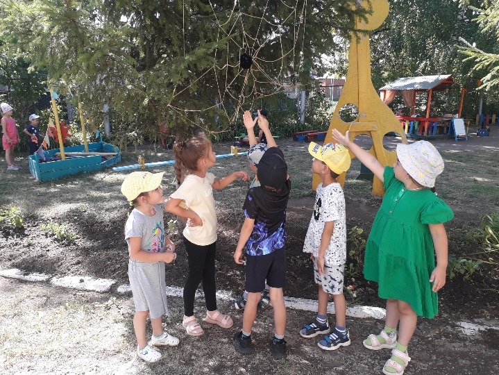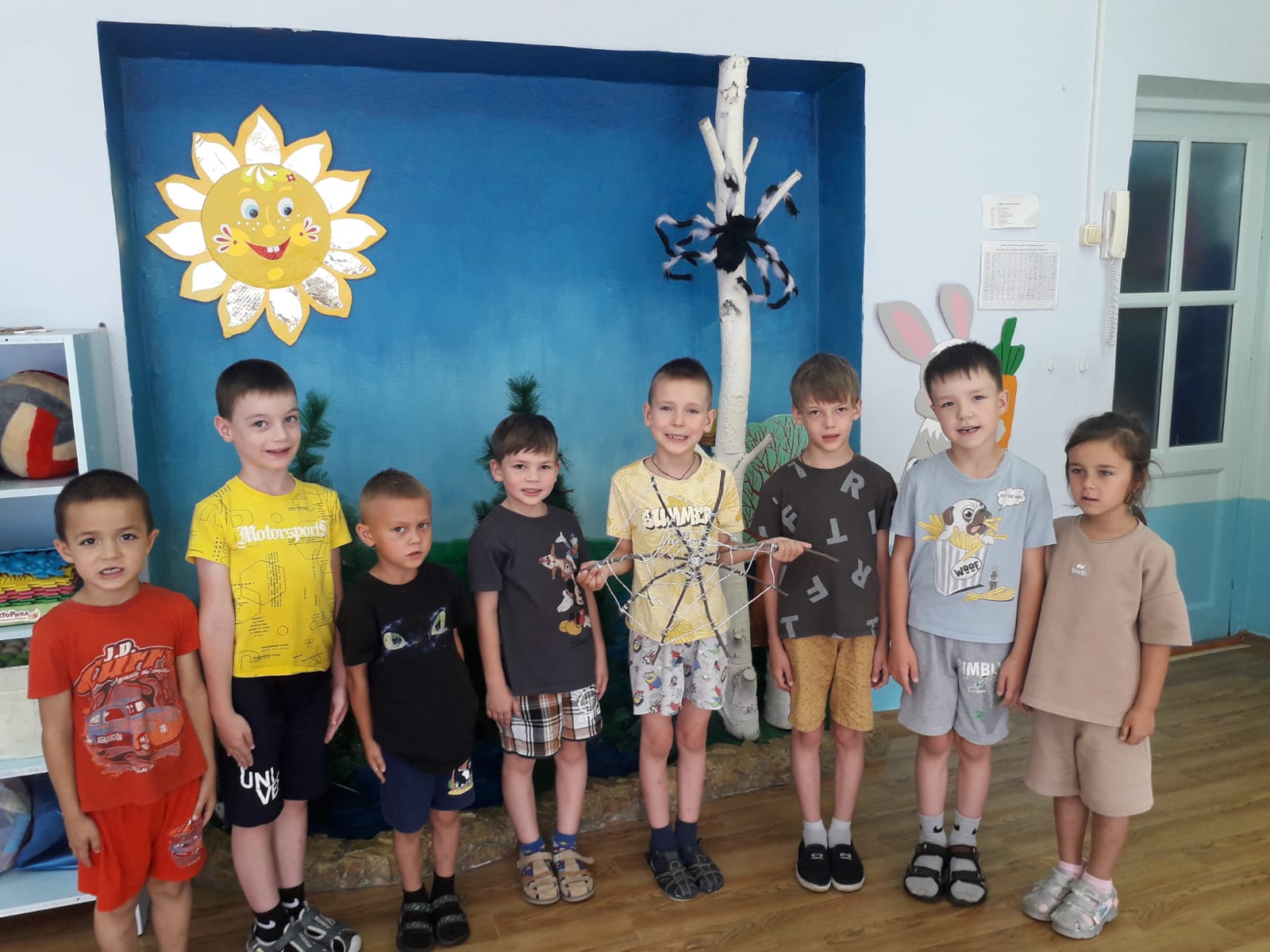 — Мирон загадал загадку: "В уголке висит сито, не руками свито". (Паутина), и поделился сообщением о том, как пауки плетут паутину. Мирон с папой сплели "паутину", чтобы показать её ребятам. Дети с удовольствием нарисовали паутину с пауком.