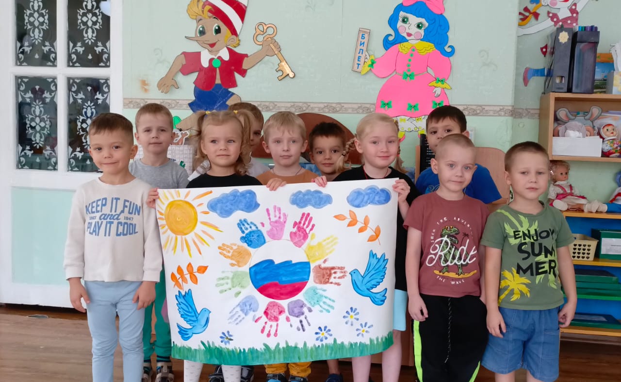На листе ватмана ребята изобразили хоровод дружбы из своих ладошек вокруг земного шара. Целью данного мероприятия было воспитание патриотических чувств детей и воспитание интереса к истории своей Родины.