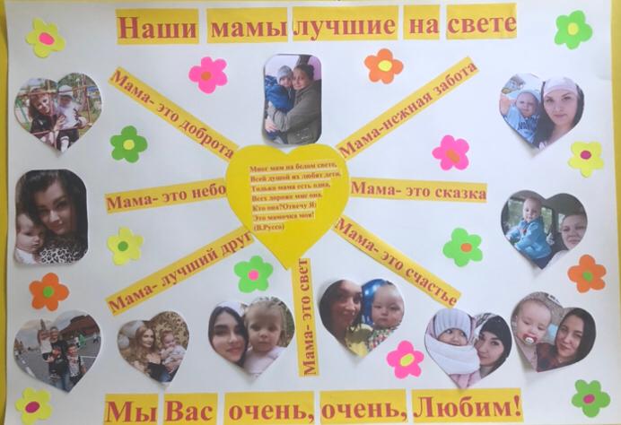 Слово «МАМА» всегда отзывается чем-то родным и приятным в душе каждого человека на протяжении всей жизни. Педагоги ДОУ для формирования любви и уважения к матери проводят много разных форм работы. В канун Дня Матери группу "Капельки" (Савина О.А., Моргачева Н.) украсил фотоколлаж «Наши мамы — лучшие на свете!».