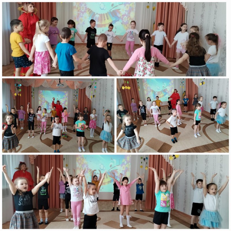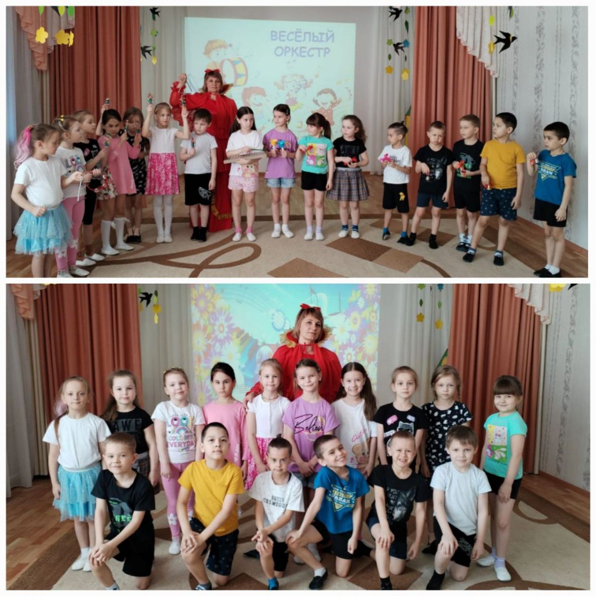 В гостях у ребят была сама госпожа Музыка. Она рассказала детям что такое музыка и историю её возникновения. Госпожа Музыка принесла с собой музыкальные загадки "Угадай мелодию" и "Музыкальный эрудит". Также дети играли в игры и водили весенний хоровод. Закрепили знания о музыкальных инструментах и показали свой Весёлый оркестр. В завершении вместе исполнили песню и станцевали дружный танец.