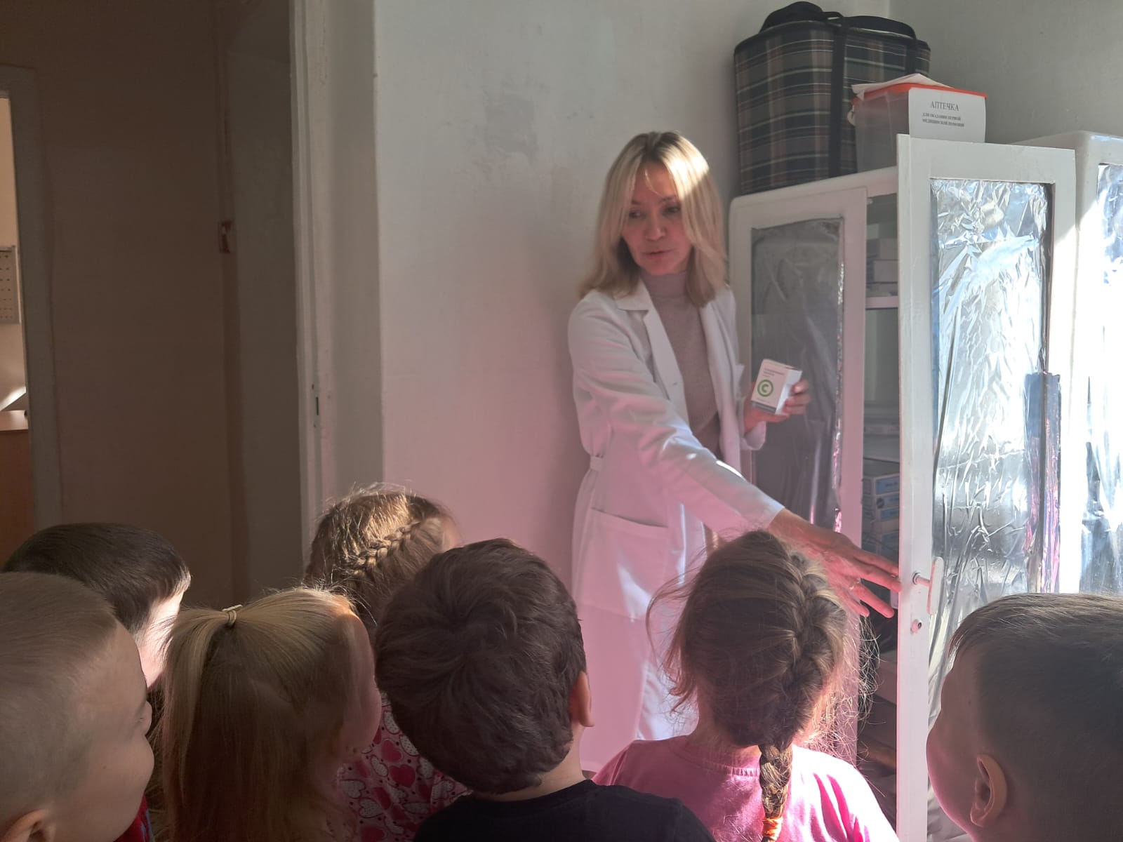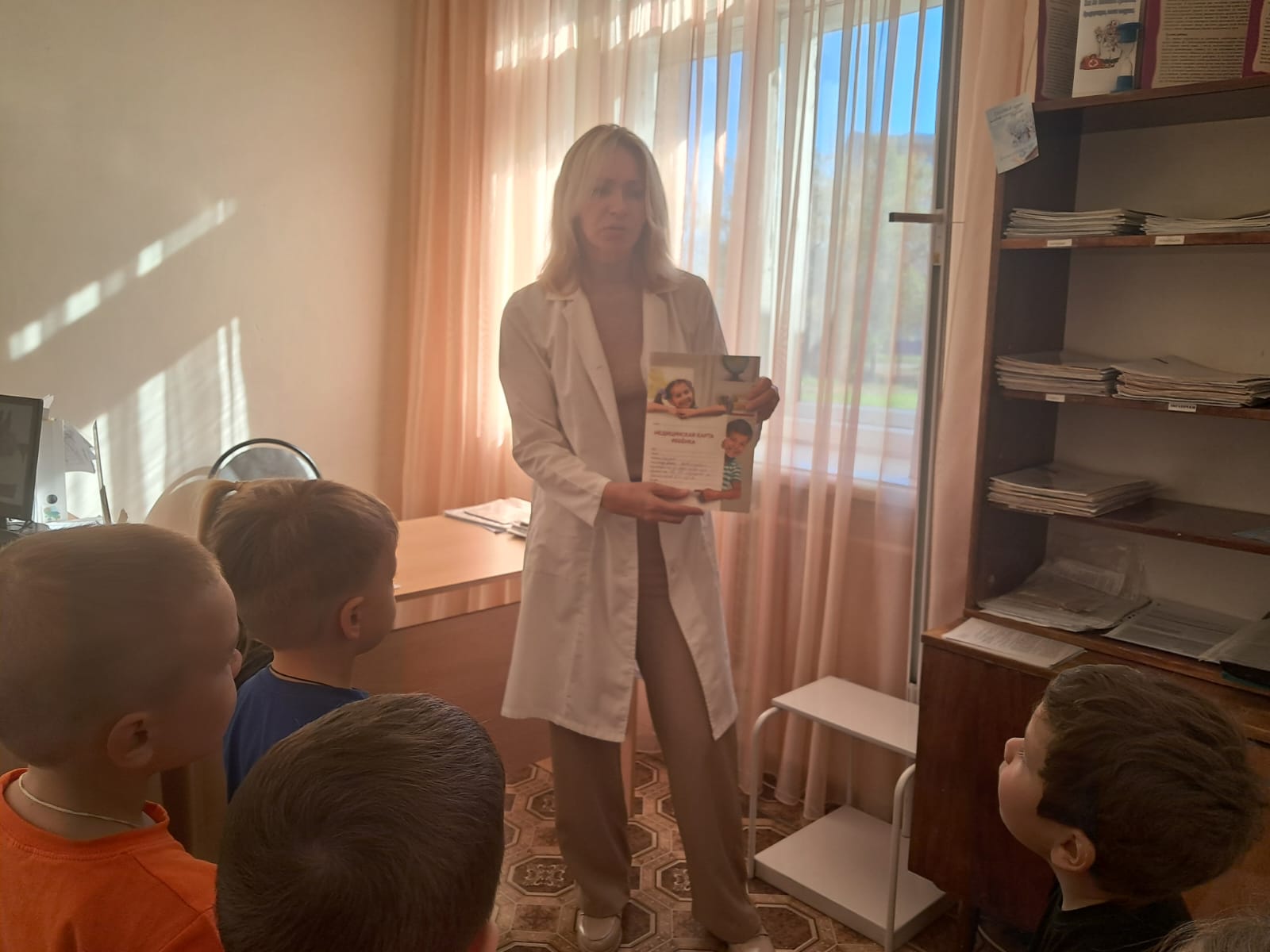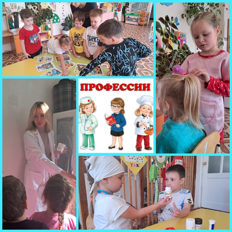 С детьми проводились беседы "Профессии ваших родителей", "Кем ты хочешь стать?"; рссматривали иллюстрации, играли в дидактические и сюжетно-ролевые игры "Назови профессию", "Кто что делает?", "Больница", "Салон красоты"; наблюдали за трудом сотрудников детского сада; все вместе посетили медицинский кабинет детского сада, где наша медсестра Гульназ Минталиповна рассказала о своей работе.