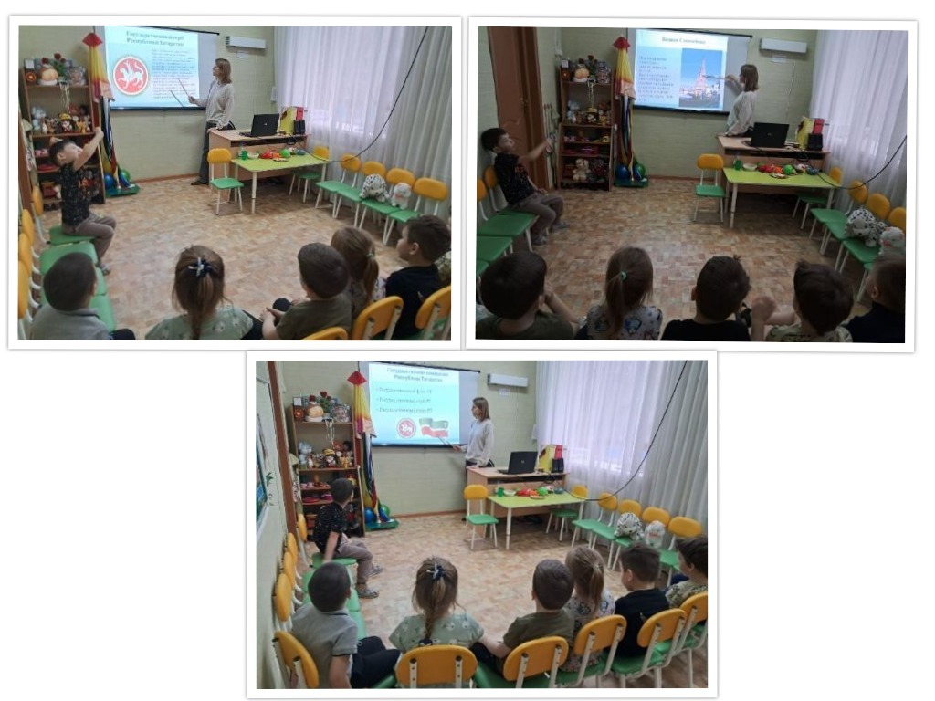 Итоговым мероприятием данной тематической недели стал просмотр презентации «Татарстан – мой край родной!», где дети закрепили знания о государственных символах Татарстана – флаге, гербе, гимне; познакомились с достопримечательностями Казани — столицы Республики Татарстан.