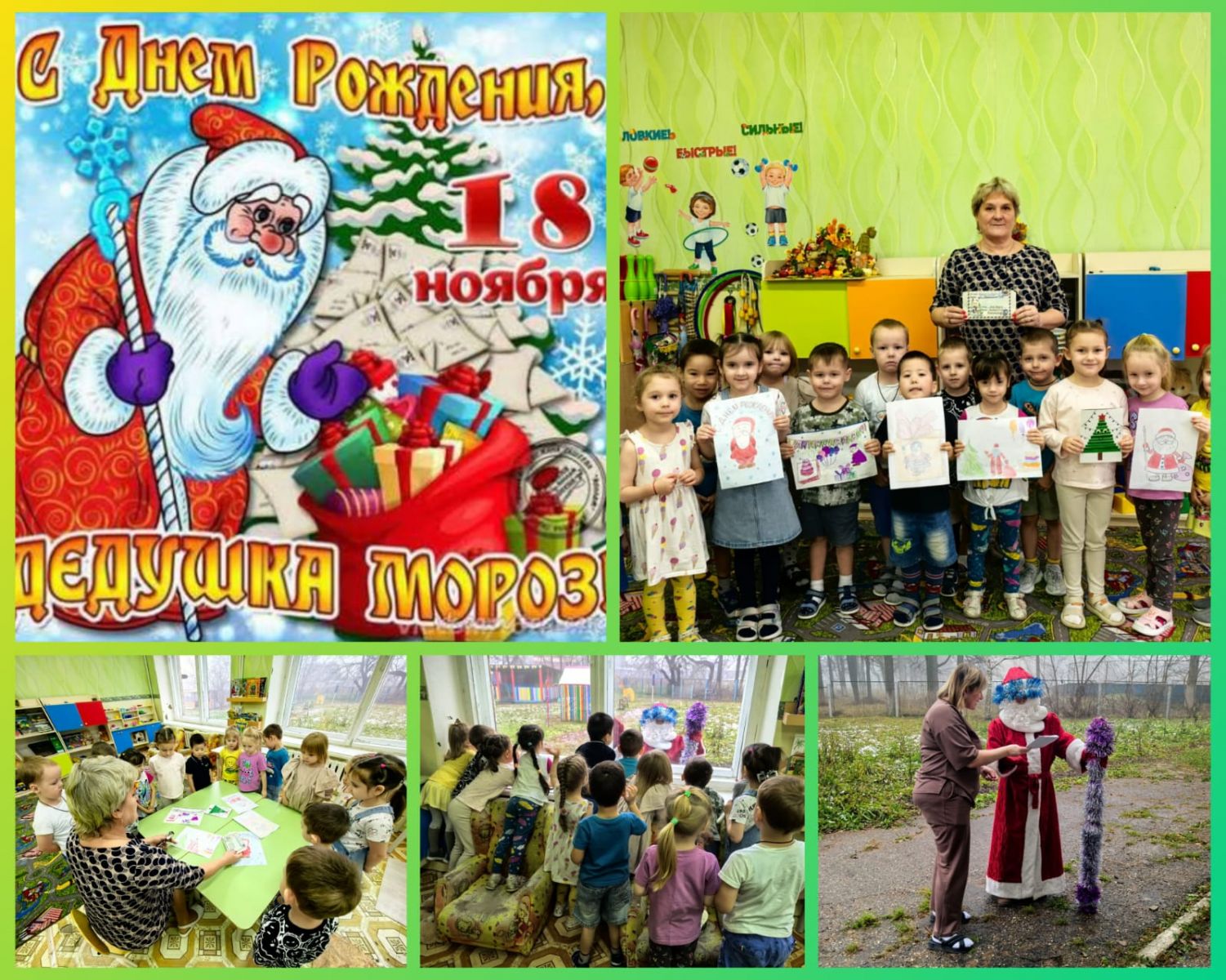 Сегодня воспитанники группы "Радуга" приготовили и передали Деду Морозу письмо с рисунками, в которых они изобразили портрет именинника и пригласили его в детский сад на Новый год. Этот день доставил детям много удовольствия и восторга!