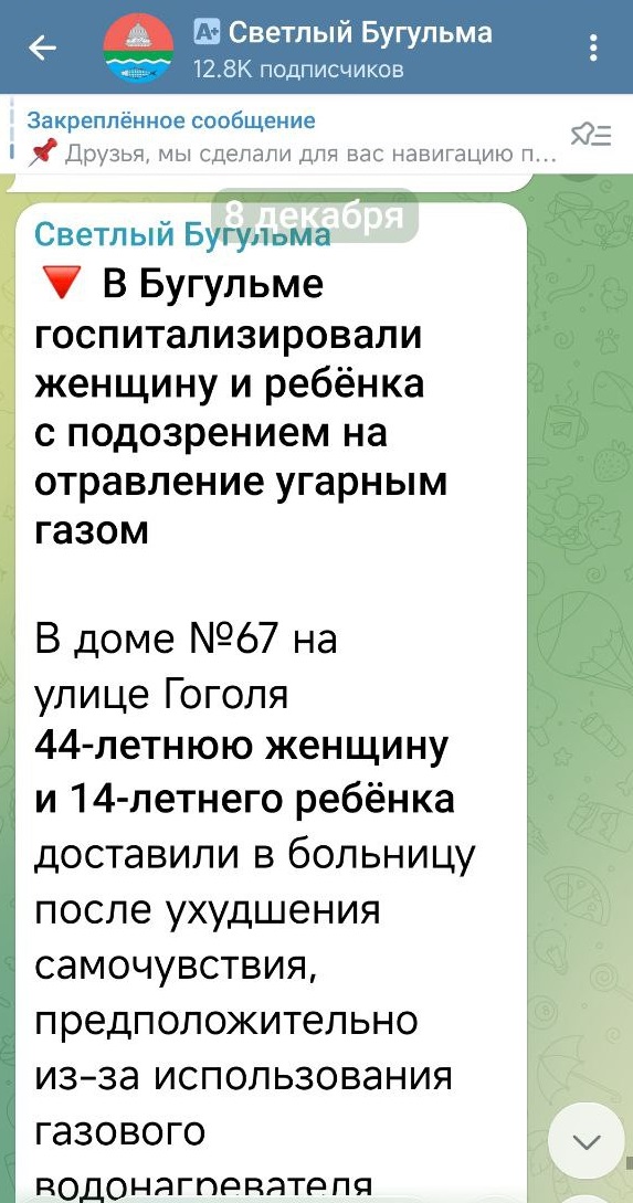 После случая отравления угарным газом в Бугульме мамы и ребёнка (новости от 8 декабря 2025 года), 10 декабря 2025 года в детском саду прошла акция "Безопасная среда" с целью закрепления знаний о бытовом газе, его пользе и опасности. Проводились беседы на тему «Осторожно — газ!». Воспитатели провели занятия по безопасности со старшими дошкольниками. Цель проведения мероприятий – систематизировать знания детей, подвести к пониманию вероятных последствий детских шалостей, учить правилам поведения при утечке газа.